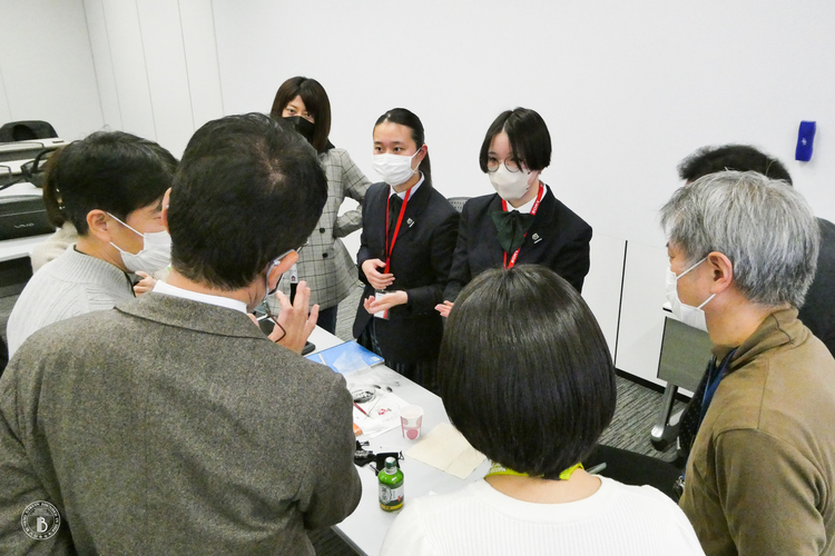本校の生徒の研究は、紅と墨を用いた江戸時代の化粧法の研究です。紅と墨を混ぜたときに色がどのように見えるかという研究は、なかなか専門の方がおらず、生徒たちは専門的な意見を強く望んでおりました。ソニー様との交流会ではその念願がついに叶い、普段デジタルカメラに関する技術を研究されているエンジニアの方より研究に対する非常に多くの助言をいただくことができました(エンジニアの方はこの助言のために高い紅を購入され、ご自身でも実験をされていたとのことで、生徒も引率教員も感動していました)。