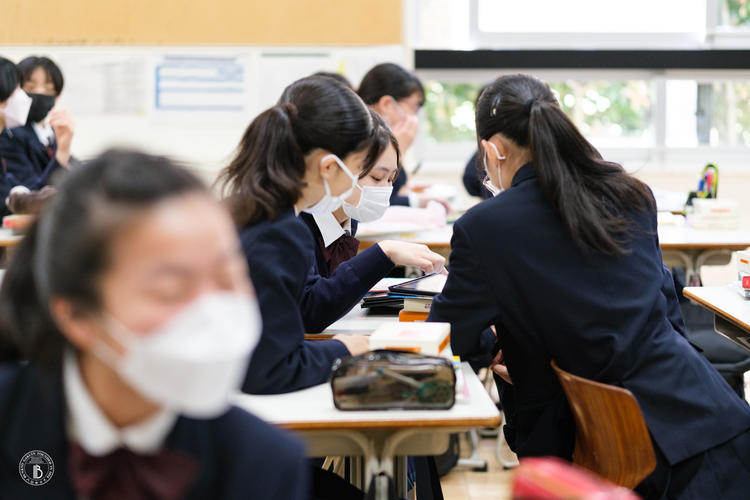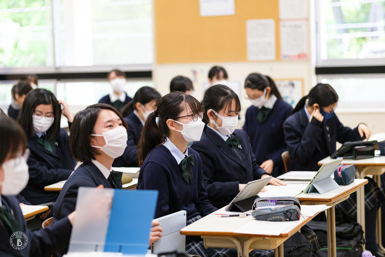 本校の学びの特徴が色濃く出る「コラボ授業」、「探究活動」、ICTの活用、を基本テーマに、学年やコース、更には中学校・高等学校を横断するかたちで様々な授業をご見学いただきました。例えば、中学1年「数学」や中学2年「社会」のコラボ授業。英語で数学や社会を学ぶことで、教科の内容は勿論、英語を「道具」として扱うことを学ぶことになります。